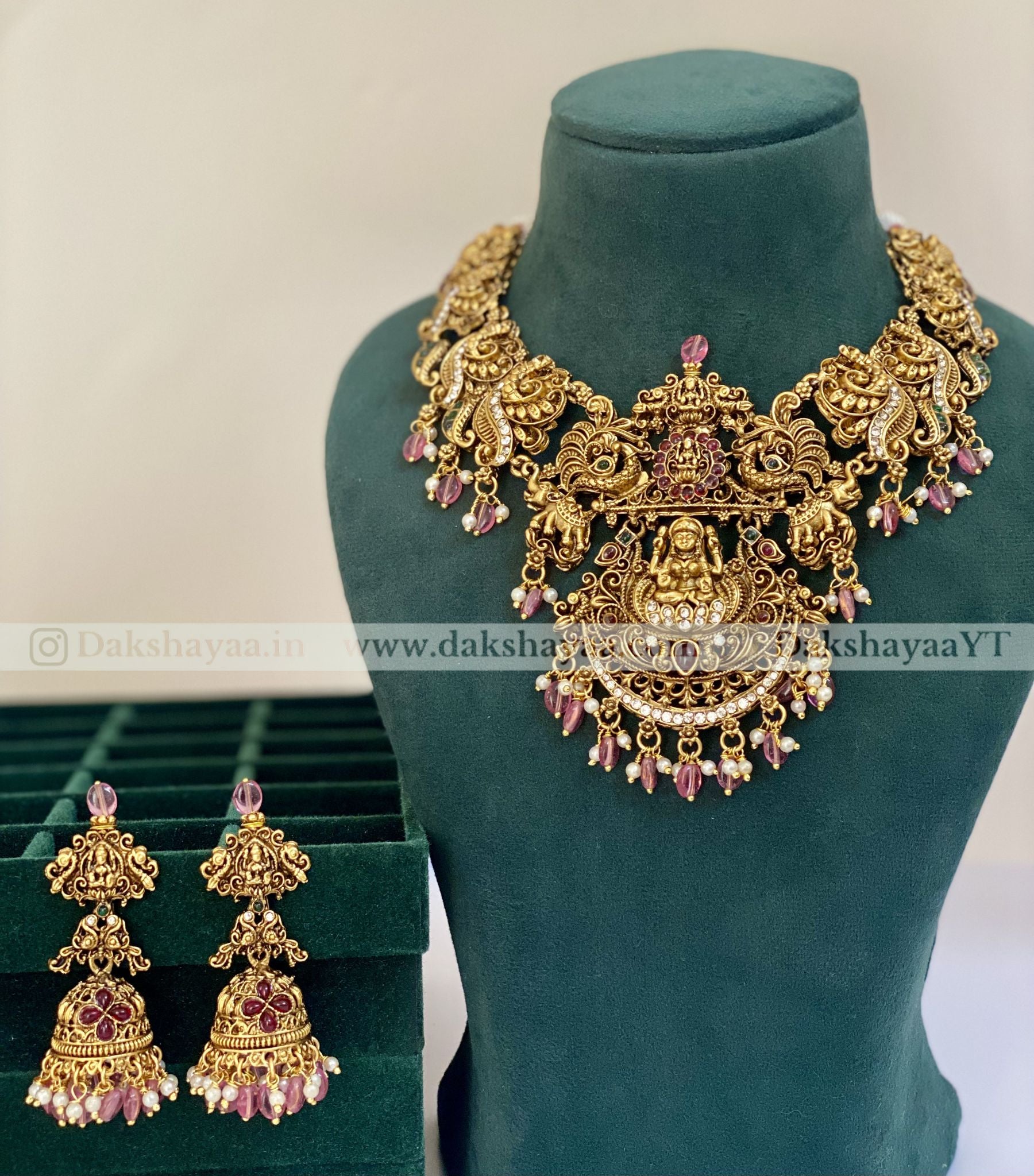 Design: Traditional heavyweight temple style with divine Lakshmi motif, detailed peacock and paisley patterns, a statement pendant, and rich rows of bead droplet embellishments in pink or red; paired with grand jhumka earrings reflecting the necklace style